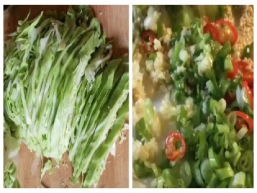 包菜 1個,小蔥 兩三顆,鹽 適量,油 適量,大蒜幾瓣,紅尖椒 2個,白芝麻 適量,白糖 1勺,白醋 適量