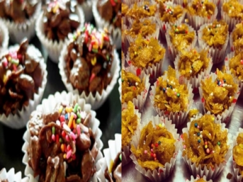 材料:玉米片 75克,黃油 50克,糖漿 4湯匙,優質黑巧克力 1條 100克