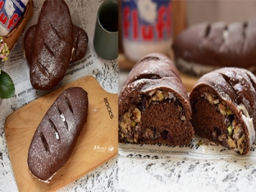 這個棉花糖可可軟歐包有著柔軟的麵包,可可的濃郁香味,還有豐富的餡料,核桃和開心果被棉花糖包裹著,咬一口麵包多重享受,吃著每一口都很有幸福感。
