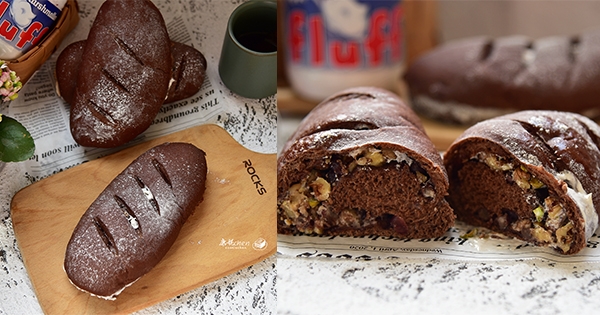 為什麼我把這次做的這個麵包是可可麻薯麵包變化版呢?因為我用了可可麻薯麵包的麵包的配方,可可麻薯麵包的的內陷有麻薯和堅果果乾,我沒有做麻薯部分,而是改成了塗抹棉花糖,我放了核桃、開心果和紅豆,這個搭配有軟有硬,關鍵很營養,紅豆益氣補血,核桃可以補腦健腦,我在麵包皮上塗抹棉花糖,棉花糖經過烘烤融化在麵包表皮和堅果上,吃著有爆漿的口感,經過烘烤後的棉花糖外層結成了酥脆的糖衣,咬開之後發現內芯已完全融化,口中頓時感受到了真材實料的充裕口感,在這個麵包的內心塗抹了棉花糖,給這個麵包帶來了很獨特的口感。