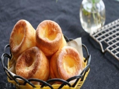 但是,卻有這樣一種布丁,卻算是麵包的一種,可甜可咸,不用酵母,不用泡打粉,只要雞蛋、牛奶、水和麵粉,攪拌均勻,烤一烤,就能高高地膨脹起來,根本不是甜品,實質是英國的一道菜,它的名字叫——約克郡布丁!