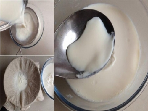 5、全部豆漿做好之後,用勺子將浮沫去掉,再用濾網過篩一次。6、用原汁機榨出的豆漿還是會有少許豆渣在裡面的,用購買內脂時店家贈送的濾布過濾一次,這一步對成品是否嫩滑也很重要喲,別偷懶。