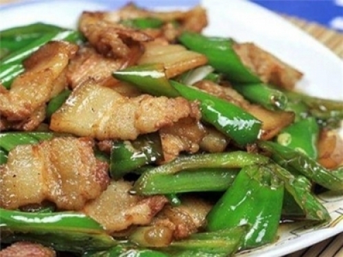 5.鍋中留底油,放入尖椒段,炒至表皮有點快糊的時候,放入五花肉,一起翻炒均勻。