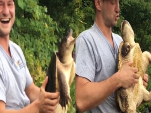 抓到鱷龜後,男子和興奮不已,並將頭對向鱷龜,作勢要親牠。