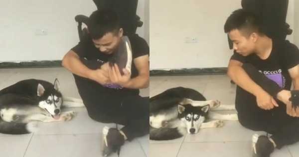 只見影片中,男子應該是因為筋太硬,沒辦把腳放到自己的脖子上,結果一旁哈士奇看主人試了很久都沒辦法成功,下一秒竟然....網友笑噴:主人整個傻眼!