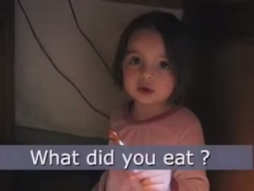媽媽看到小女孩躲在桌子底下問他你在幹嘛,小女孩說我在吃東西,媽媽問他你在吃甚麼,小女孩馬上高舉自己的棒棒糖!媽媽接著問他說你吃了幾顆糖果,小女孩開始用手算說自己吃了四顆糖果!
