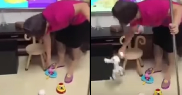 ▲這個時候有一個小雞的玩具在地上,於是阿嬤就伸手把他拿起來,結果居然怪怪的?!