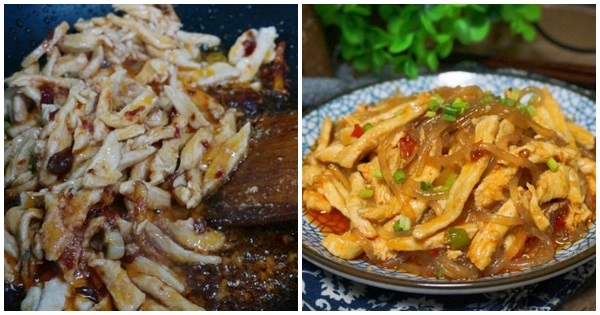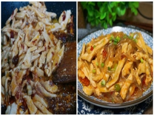 1.雞胸肉切成絲,不要太細,加入蛋清和鹽醃製15分鐘左右。