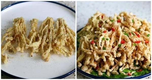 經過蛋液和澱粉包裹的金針菇,油炸之後膨鬆起來,又香又酥,嘎嘣脆,好吃到停不下來,真的太好吃了!