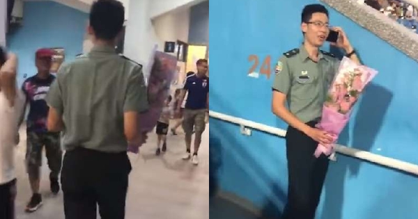 這天有位網友在《爆廢公社》PO文,說這天要去看球賽,無意間看到一位軍人拿著花束,站在觀眾席附近徘迴,就好奇的上前搭訕,才發現對方是位陸軍少校,等下準備要跟女友求婚,網友知道他沒有親友團助陣後,決定熱心的幫助他記錄下整個過程。