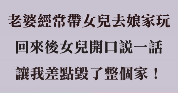 大家好,我是 Choco 今天來跟你說說 老婆經常帶女兒去娘家玩,回來後女兒開口說一話 ,讓我差點毀了整個家!吧!讓我們來看看!
