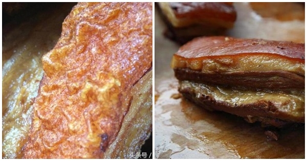 接下來這一步很重要,就是豬肉炸起來後用一個盤裝點水把肉放盤上,豬皮朝下,盤上面的水可以沒過豬皮就可以了,待豬皮浸泡三五分鐘,炸完如下圖。