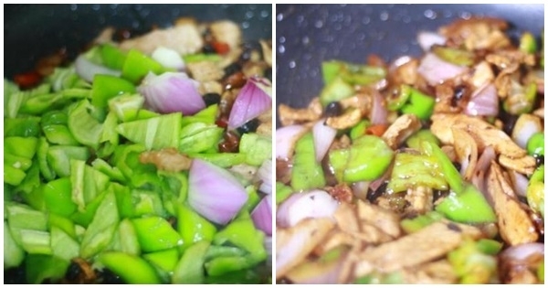 9、加入切好的青椒、紫皮洋蔥一起翻炒
