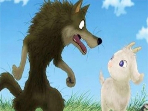 傍晚,一隻羊獨自在山坡上玩。突然從樹木中竄出一隻狼來,要吃羊,羊跳起來,拼命用角抵抗,並大聲向朋友們求救。