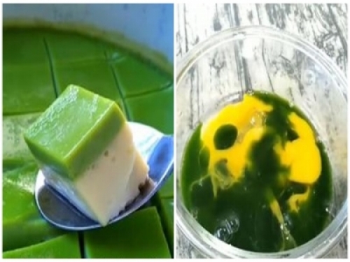 黃色的蛋液蒸到半凝固狀態,在把綠色蛋液的倒上去