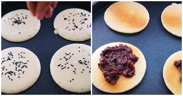 平底鍋預熱,不需要放油,麵糊一勺一個直接放入鍋中。
