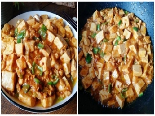 食材:白豆腐、豬肉、尖椒、食用油、蔥、姜、大蒜、黃豆醬、料酒、醬油、水澱粉。
