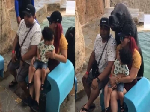 一家人開心跟海豹合照!沒想到攝影師一按快門,居然出現神奇的畫面,讓網友驚呼:工讀生快出來!!!