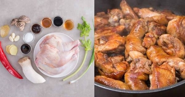 雞脾 3 隻 乾冬菇 6 隻 杏鮑菇 1 隻 紅尖椒 1 隻 芹菜 1 棵 蔥 1 條 蒜頭 4 瓣 薑 4 片 花雕酒 5 湯匙 黑麻油 2 湯匙 老抽 2 湯匙 生抽 2 湯匙 蠔油 1 湯匙 冰糖 1 湯匙 砂糖 1 茶匙