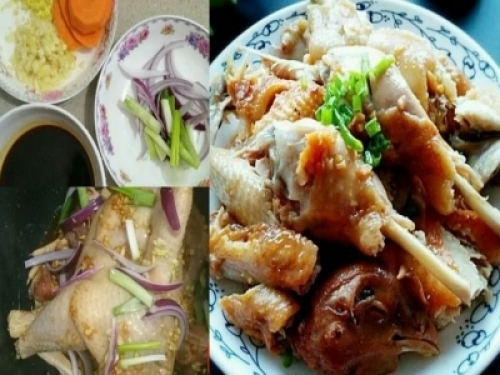 雞肉一只、洋蔥少許、蔥白五根、生抽一大勺、蚝油一小勺、芝麻油少許、雞汁少許、料酒一茶匙、鹽適量、糖少許、蒜頭一個、姜末適量、胡蘿卜幾片、排骨醬少許