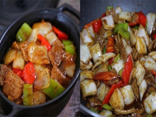 食材:牛肉300克,洋蔥1個、紅辣椒1個、綠辣椒1個、蔥薑蒜適量