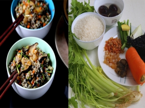 材料:大米250克,紫菜10克,蝦米、干貝、海蠣干各15克,香菇4朵,胡蘿蔔100克,芹菜50克,洋蔥30克、生薑10克、小蔥15克,香菜4根
