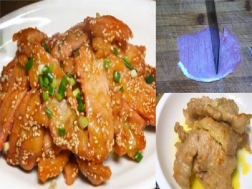切好之後把刀反過來,反復敲打肉,這樣做出來的肉會嫩滑酥脆。