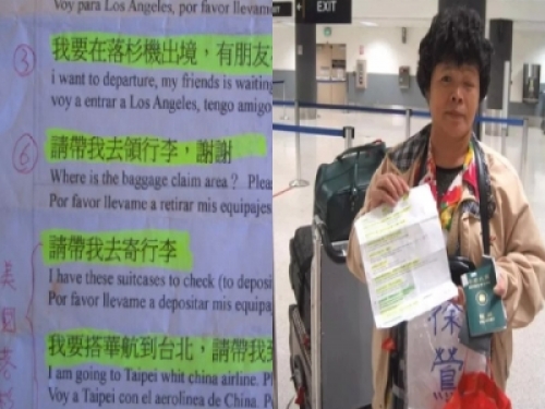 回程時,阿嬤在洛杉磯巧遇民視記者蕭慧芬,看到孰悉的亞裔面孔,阿嬤忍不住問她:「妳會講國語嗎?」聽到蕭慧芬說會,阿嬤開心地把手上的小抄遞給她看,只見上面寫著中文、英文及西班牙文。