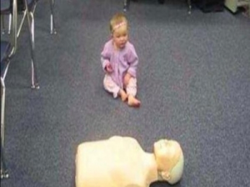 然後,小寶寶居然開始對假人做起了人工呼吸……