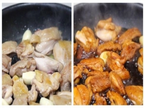 3雞塊變得金黃色時,加入米酒、老抽、生抽和黃冰糖調味,不需要