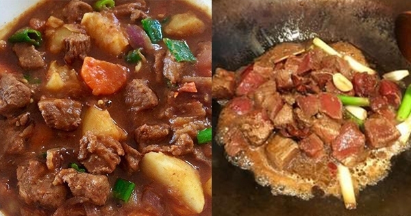 翻炒幾分鐘後,加入熱開水以淹沒牛肉為主。蓋上鍋蓋,燒開後轉小火燉15分鐘。
