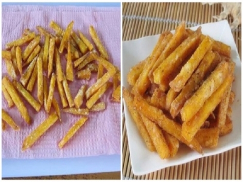 待油溫再度升高時,再放下復炸一次撈起,控干油份。