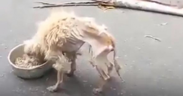 小白狗半身毛脫光,瘦得皮包骨像是骷髏,好不容易吃到飯只顧低著頭猛嗑,