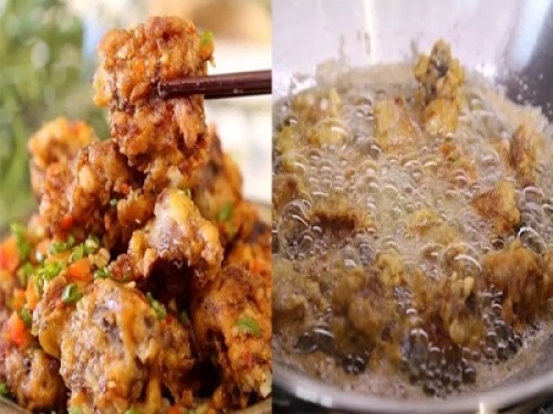 7、油溫五六成熱的時候下入排骨,中小火油炸,炸到排骨金黃酥脆後開大火快速炸一下後出鍋。