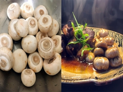 〔做法〕 蘑菇買回來後,擦乾淨菇身,修去菇角。 每顆蘑菇用刀刻出深淺,為什麼要這麼刻,後面成品就有答案。 干鍋,小火,逐一放入一顆顆蘑菇。(先煎菇角這一面) 鼻子聞到菇香後,一顆顆蘑菇就該翻身啦。(雕刻花紋面被鍋子乾烤後,會產生烙印的美感) 紅燒排骨的醬汁,取一大勺來燒煎香的蘑菇,等待收汁即可。(蘑菇吸收排骨醬汁後,與菌菇香氣結合,一咬下去,馬上知曉)