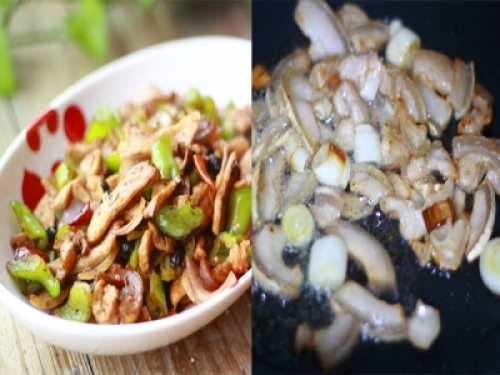 豬肉150g、紫皮洋蔥1個、青椒4個、豆豉2大勺、紅泡椒10個、大蔥1小段、食用油少許、鹽適量、醬油幾滴、生抽1勺
