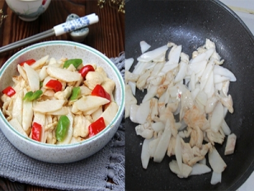 這道菜要快速烹飪,中途不要添加水分,山藥烹飪途中會出水,這樣才能保持山藥脆嫩的口感。 雞胸肉醃製過,烹飪過程要減少鹽的用量,讓山藥有個底味就可以了。