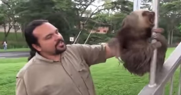 影片一開始,只見到這位工作人員,想把黏在欄杆上的樹懶給抱下來,沒想到樹懶的反應卻讓他當場超傻眼!