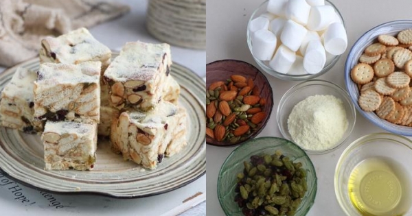我用餅乾、奶粉、棉花糖和一些堅果來做這款非常有特色的零食。沒想到做好後,味道還是非常棒的呢!過年女兒最饞這零食,做法簡單,10分鐘搞定,比牛扎糖好吃又營養!這款零食可以按照自己的喜好靈活變化,口感也能做出無窮多的層次呢!過年糖果別買了,只要一口平底鍋10分鐘搞定,自從學會再也沒買了!我們現在就來一起試一試吧!