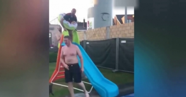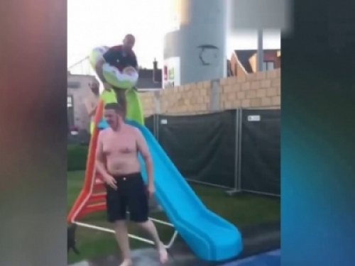 影片中只見一群大叔們很開心地在水池邊玩水,而且一旁還擺著兒童在玩的溜滑梯,突然這名大叔想要找回自己的童心,就這樣站上去想要從滑梯上面溜下來,結果溜不到一半,滑梯竟然就這樣被他硬生生地給坐斷了!