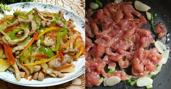 5、鍋燒熱,放適量油,爆香蒜片蔥段,下入肉絲劃散變色盛起。
