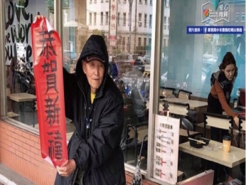 冬天的新竹風大又冷,而這位97歲老爺爺總在麥當勞前,掛上親筆寫的春聯叫賣