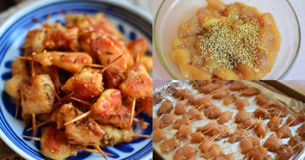 5、烤盤上墊一張錫紙,刷少許油,把雞肉串擺在烤盤上