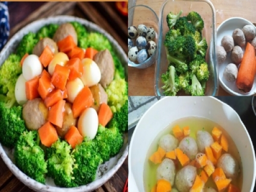 食材:西蘭花半個、胡蘿蔔1小段、鵪鶉蛋8個、丸子8個、生抽1勺、蠔油1勺、澱粉1勺、水適量