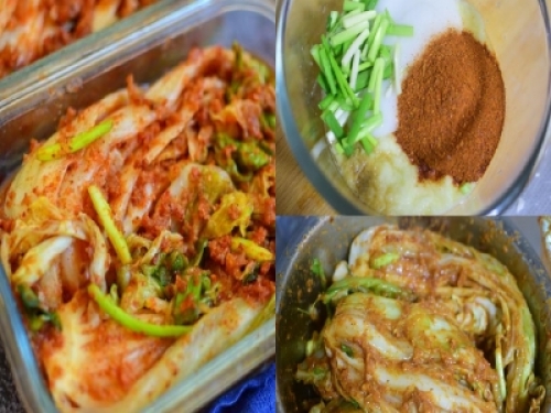 食材:大白菜1顆、小蔥3根、辣椒粉適量、洋蔥半個、蒜8瓣、白糖2勺、姜20克、魚露2勺、梨半個、蘋果半個、鹽適量、糯米粉2勺、水250毫升