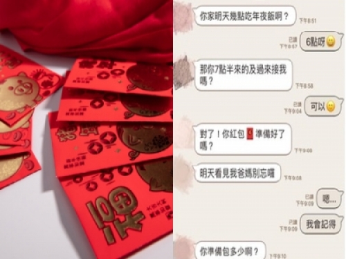 女友要求原PO除夕年夜飯後到她家中拜年,還貼心地提醒「對了,你紅包準備好了嗎?明天看見我爸媽別忘囉!」原PO聞言似乎有點不太情願,簡短回了「嗯……,我會記得。」