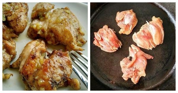 中火加熱平底鍋,倒入一半的橄欖油,然後下雞腿肉。