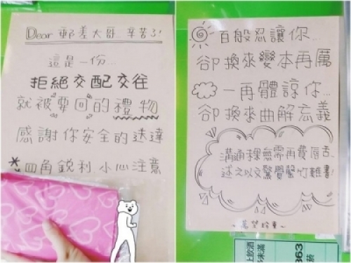 其中一面寫著「Dear郵差大哥…辛苦了!這是一份拒絕交配交往就被要回的禮物,感謝你安全的送達」,而且還溫馨提醒郵差「四角尖銳,小心注意。」