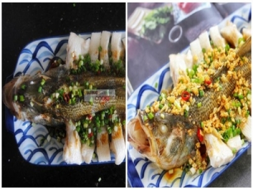5,預熱好蒸烤箱,要是用蒸鍋要煮沸後再把魚放入,大火蒸10分鐘即可,這魚有2斤重,所以蒸的時間要夠,不然不能熟透哦。