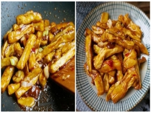 1.茄子去皮,切條。加入1克鹽稍微醃製5分鐘。